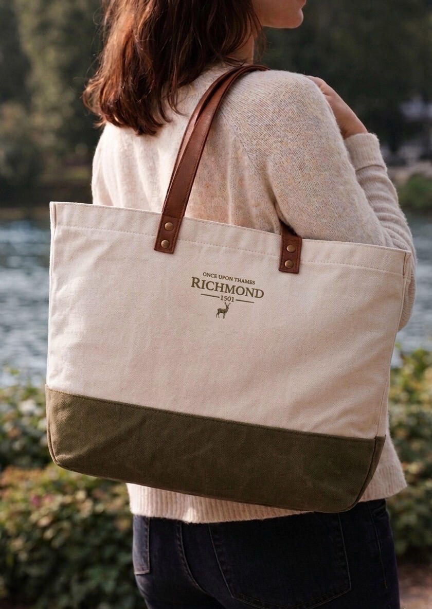 Natural canvas body that holds shape.Waxed base for pub floors and grass.Sturdy leather handles for a full market shop or a day out with small children.Richmond has been worth choosing since 1501. This piece is for those who know why.